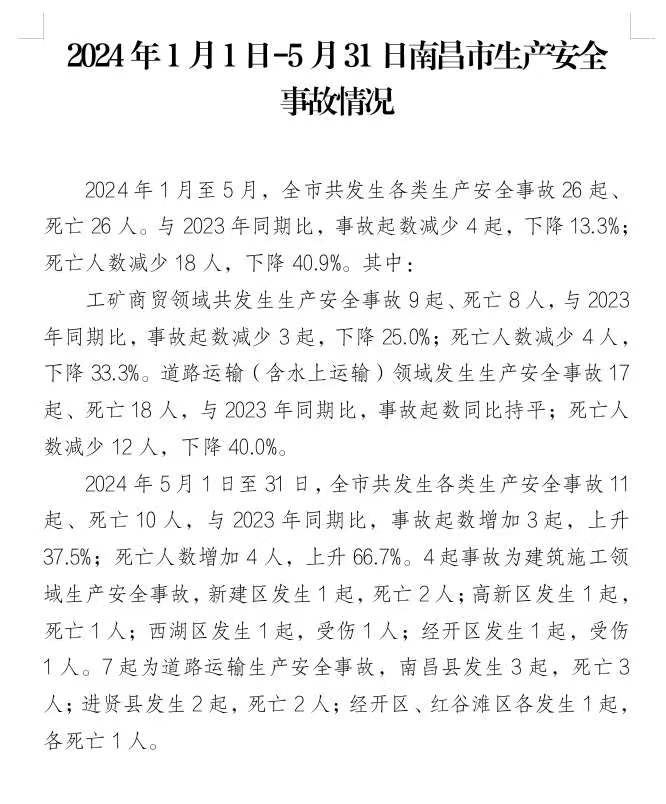 2024年1月1日-5月31日南昌市生产安全事故情况